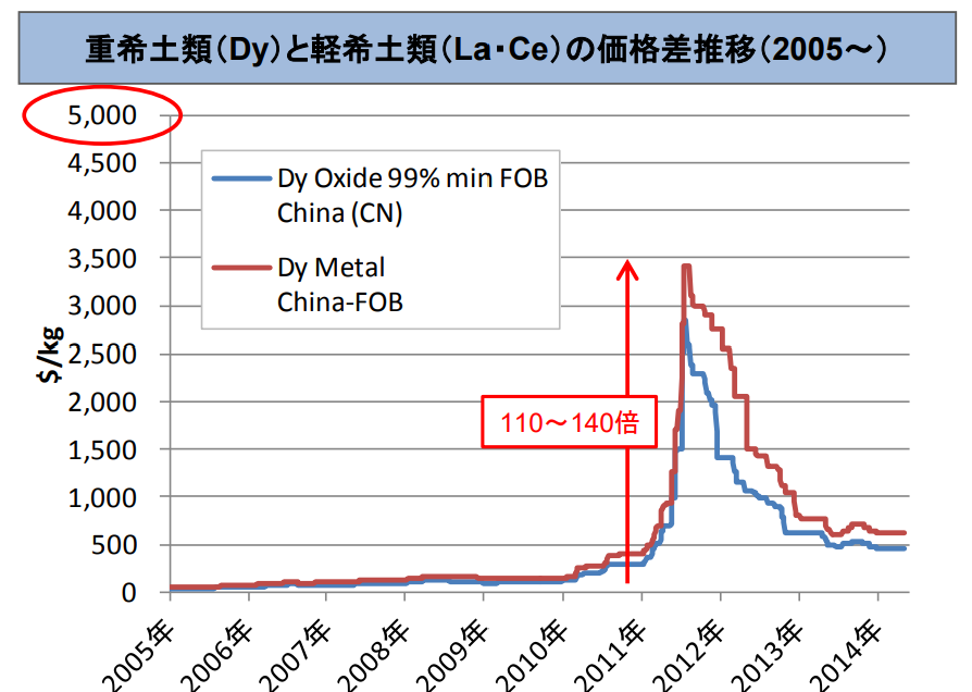 2010年の「レアアース・ショック」時、ネオジム磁石の性能を左右するジスプロシウム(Dy)の価格は、数年で100倍以上に暴騰した経緯がある。トランプ前大統領による100%関税の脅しは、この過去の価格急騰を想起させ、サプライチェーンが寸断された場合のDy調達コストを極端に押し上げるリスクを示している。